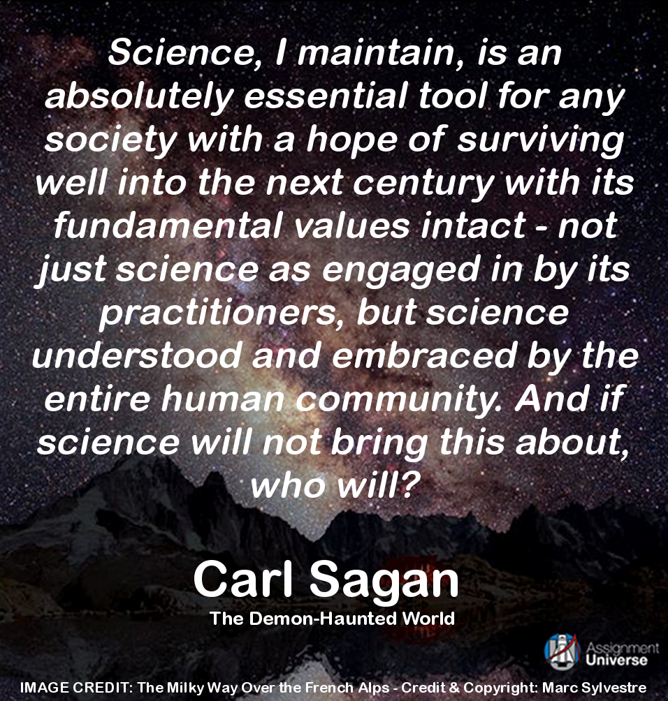 "Science, I maintain, is an absolutely essential tool for any society with a hope of surviving well into the next century with its fundamental values intact - not just science as engaged in by its practitioners, but science understood and embraced by the entire human community. And if science will not bring this about, who will?